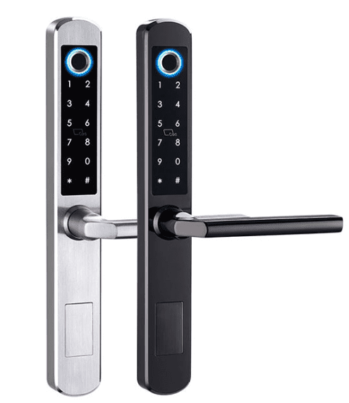 HartuSlim Smart Fingerprint atearen blokeoa — FM 210 adibide gisa. Produktu honek TUYA / TT Lock APP-aren bidez kontrolatzen du, hatz-marka biometrikoa, kodea, NFC, RF ID eta giltza mekanikoak barne desblokeatzeko metodoekin.